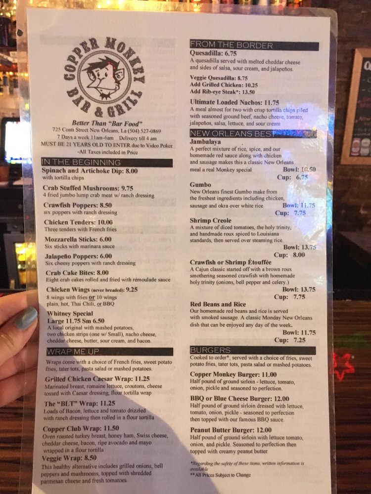 “ A local bartender recommended this place to us for beignets. We came here for takeout one night after drinking on Bourbon street. My boyfriend got a blackened shrimp poboy and my liquid courage had me ordering something I wouldn't normally order- a peanut butter burger. We also got mozzarella sticks. We failed at getting the beignets. The staff here are so friendly. Especially the doorman. But really they're all great. We appreciated the good customer service and friendly demeanor. Inside is small but typical bar environment. We got our food to go and ate at our hotel. The mozzarella sticks were really good and the marinara was delish!! The peanut butter burger was surprisingly good. My boyfriend liked his shrimp poboy, although it wasn't the best he's had in NOLA. We went back the following day and got more mozzarella sticks and the beignets. The beignets were good. I have nothing to compare them to, but we did enjoy them overall. We will definitely return to the copper monkey! ”
