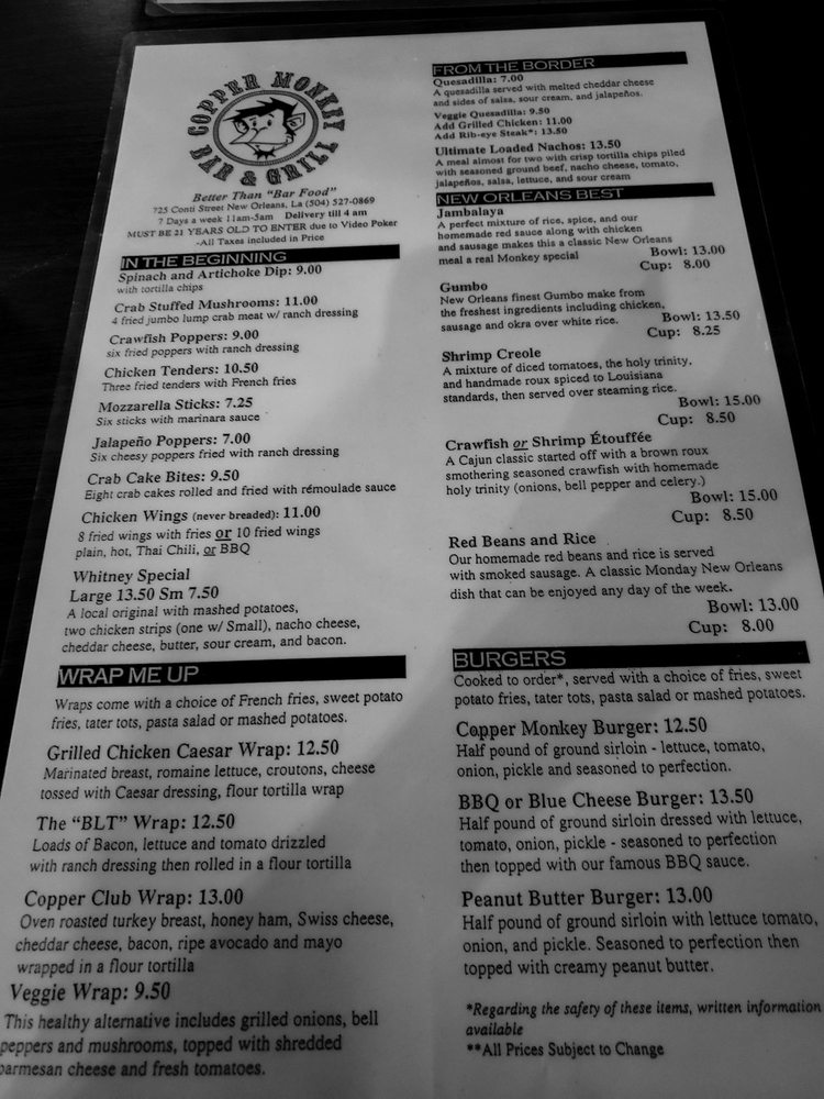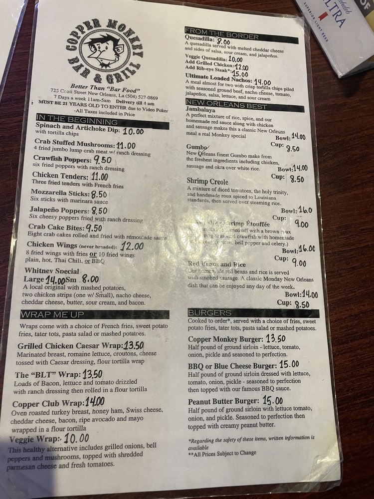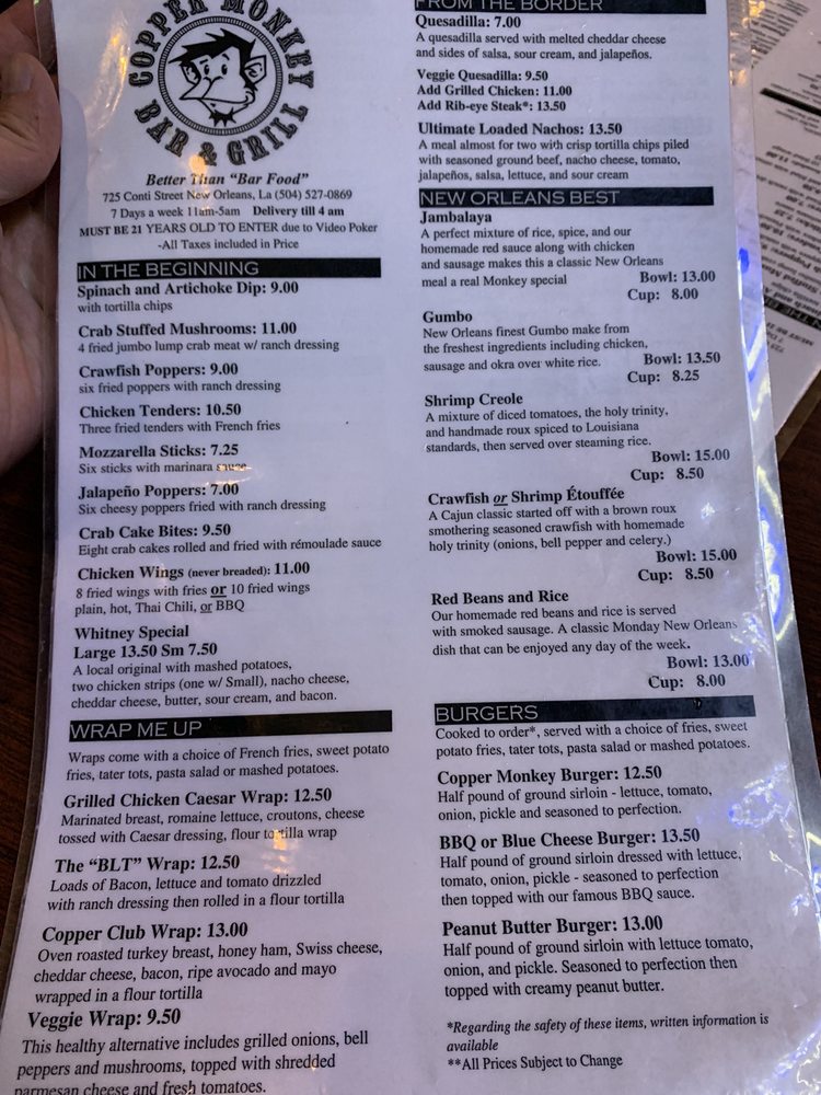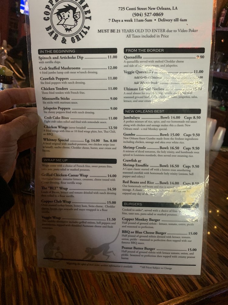 Welcome to Copper Monkey Grill, a vibrant American eatery located in the heart of New Orleans on Conti Street. This casual spot offers a variety of amenities, including delivery, takeout, reservations, vegan options, and even wheelchair accessibility. With a full bar, outdoor seating, and gender-neutral restrooms, Copper Monkey Grill caters to a diverse range of patrons.