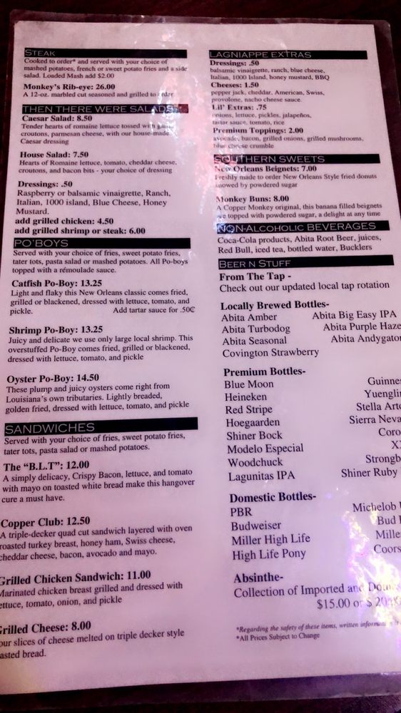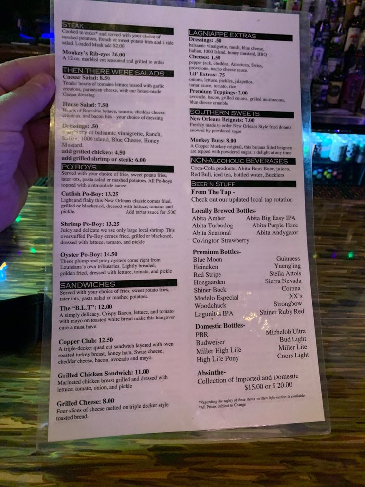 “ Wow I just now realized I have never written a review about Copper Monkey which happens to be one of our favorite places. Everything on the menu is delicious- and yes we have tried it all...I love that you can order wings naked and get the sauce on the side. Less messy that way. Oh and sometimes I just want a salad, they have them too! The staff is super friendly, we love them all. One of our favorite places! ”