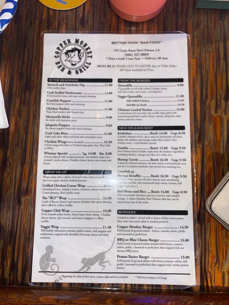 Whether you're looking for a quick bite, a fun spot to watch the game, or a late-night snack after a night on Bourbon Street, Copper Monkey Grill has something for everyone. The staff, including bartender Virginie, are praised for their efficiency and friendliness, creating a welcoming environment for all guests.